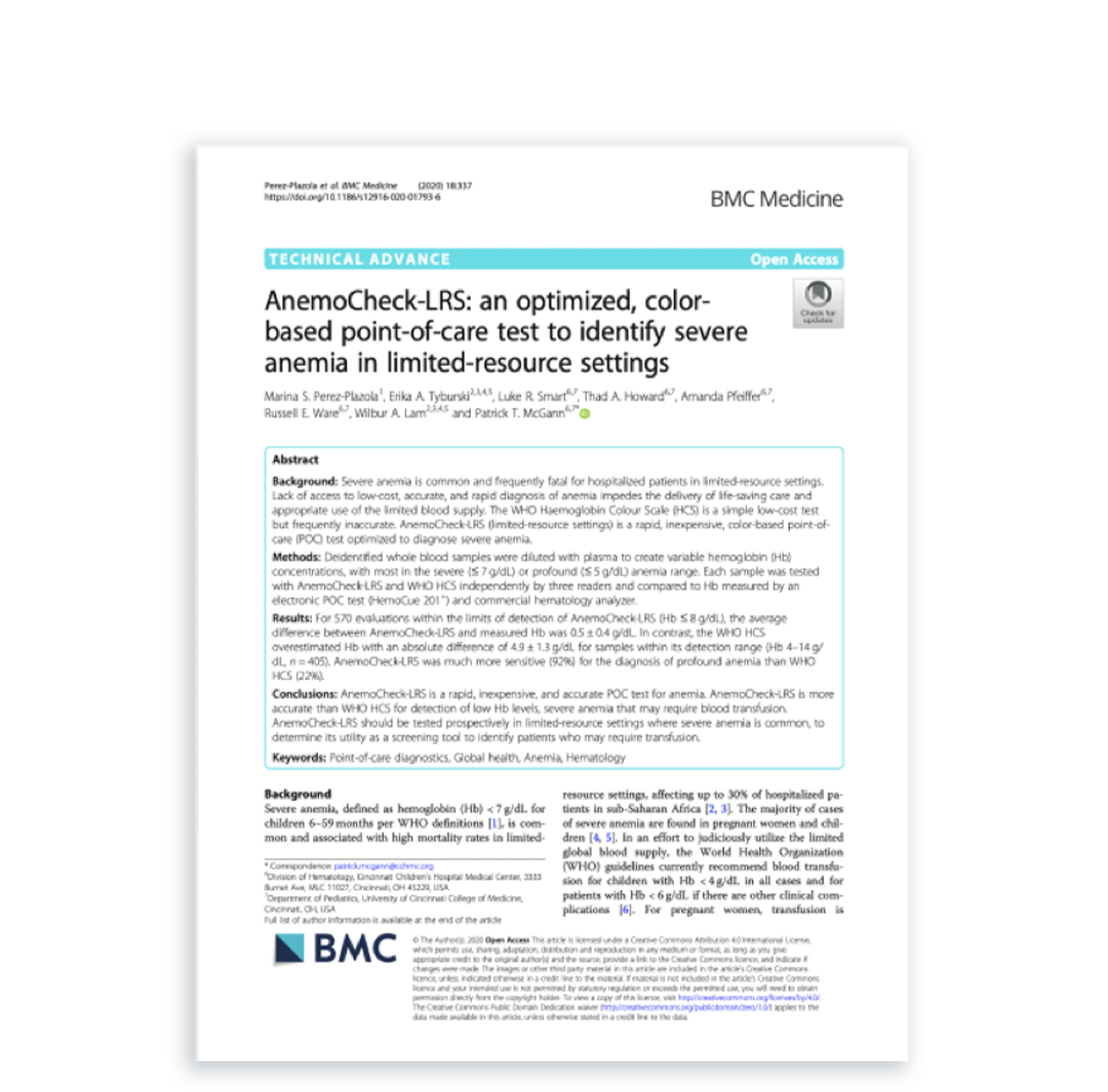 AnemoCheck-LRS: una prueba optimizada que se basa en colores y se realiza en el lugar de consulta para identificar la anemia grave en entornos de recursos limitados.